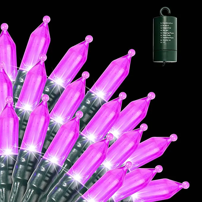 - Our holiday lights set is composed of 100 counts of Purple LED in green wire string lights. These are also battery-powered string lights (battery not included) with measurements of 34ft. The spacing for each bulb is 4 inches with each bulb’s size of 3mm*16mm.