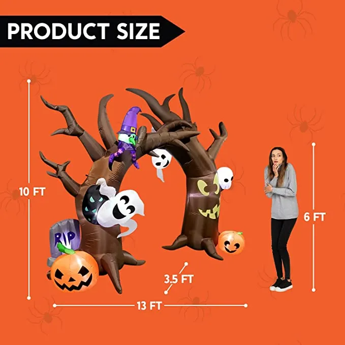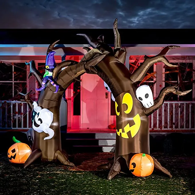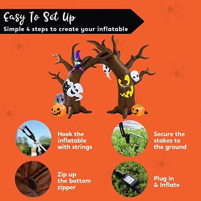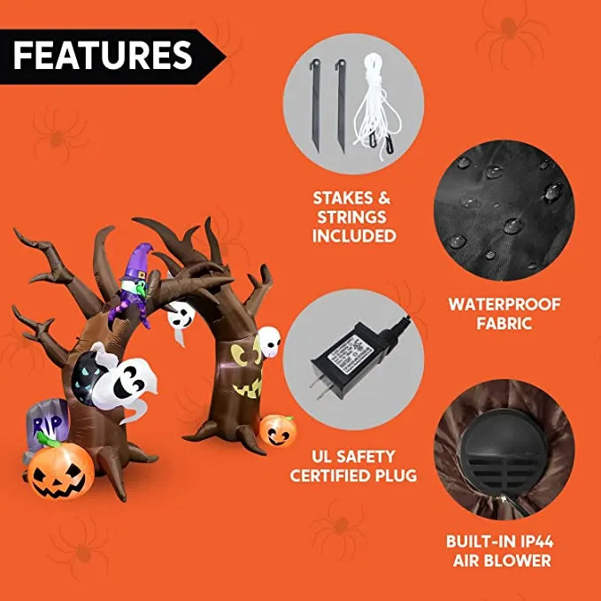 - 10 feet long tree archway with skulls and characters halloween inflatable comes with extended cords, ground stakes, fastened ropes, built-in sandbags, and a plug with UL certification.