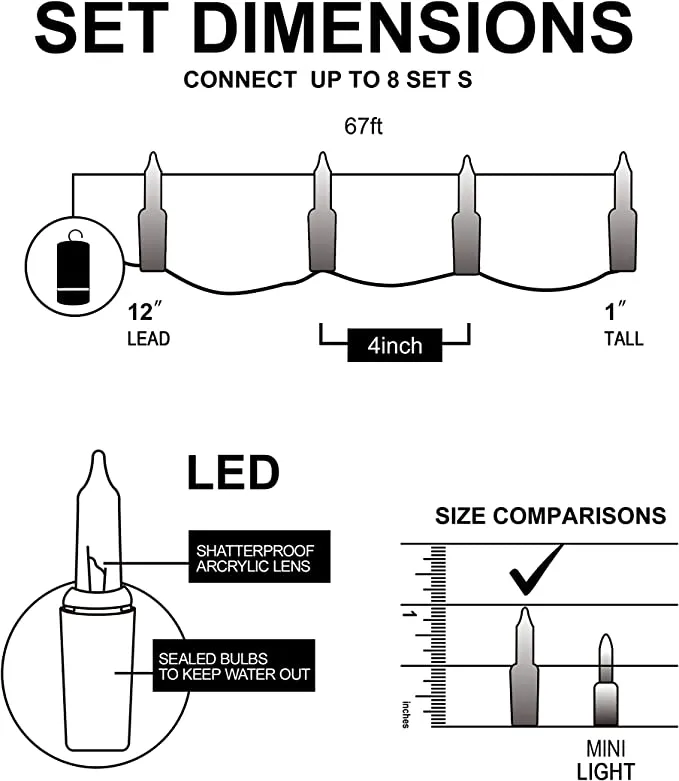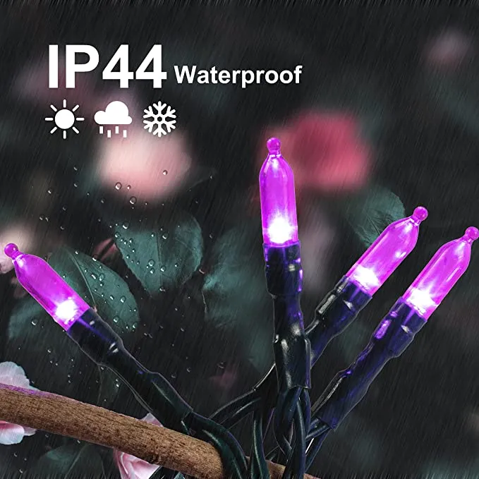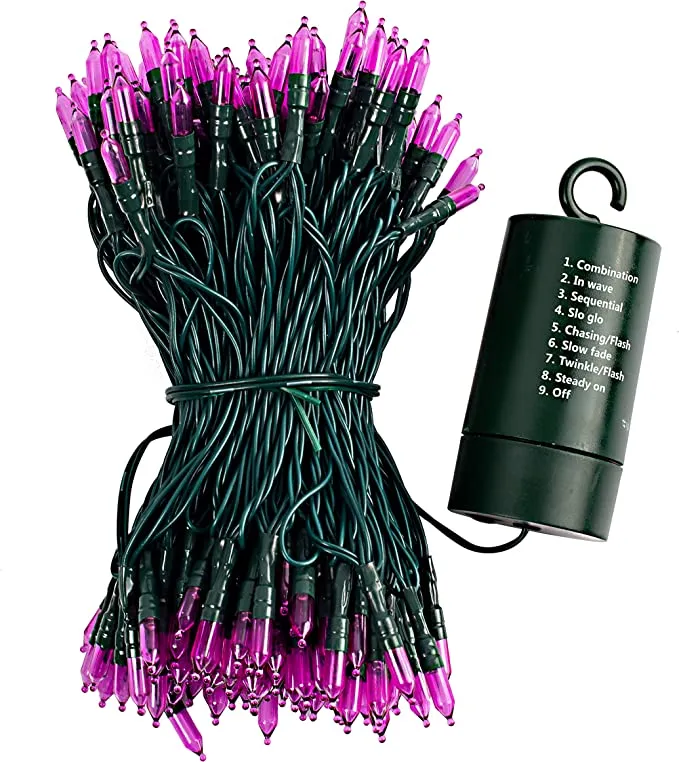 - Our holiday lights set is composed of 200 counts of purple LEDs in green wire string lights. These are also battery-powered string lights (battery not included) with measurements of 67.3ft. The spacing for each bulb is 4 inches with each bulb’s size of 3mm*16mm.