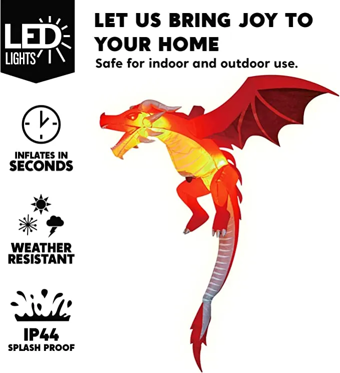 • Inflatable Dragon Lawn Decoration comes with a 5 feet tall Flying Dragon Inflatable comes with extended cords, stakes, fastened ropes, built-in sandbags, and a plug with UL certification.