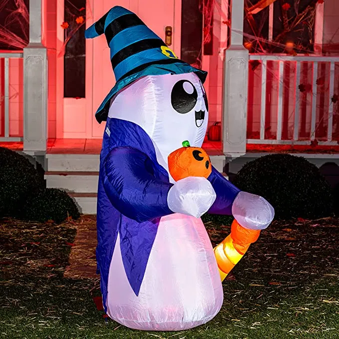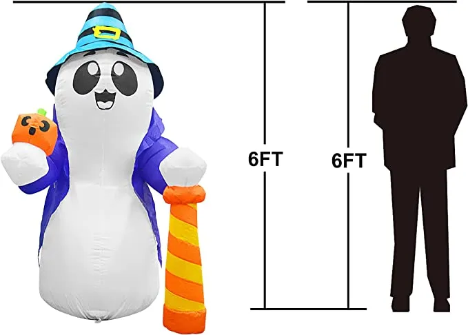 - Our 6 feet tall cute wizard ghost inflatable designed with a witch hat, flame light and orange candy cane stick. This adorable ghost Halloween inflatable comes with extended cords, ground stakes, fastened ropes, built-in sandbags, and a plug with UL certification.