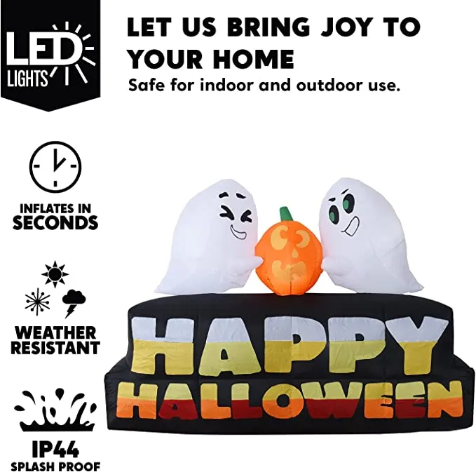 - 7 feet long happy Halloween with pumpkin and characters inflatable comes with extended cords, ground stakes, fastened ropes, built-in sandbags, and a plug with ul certification.