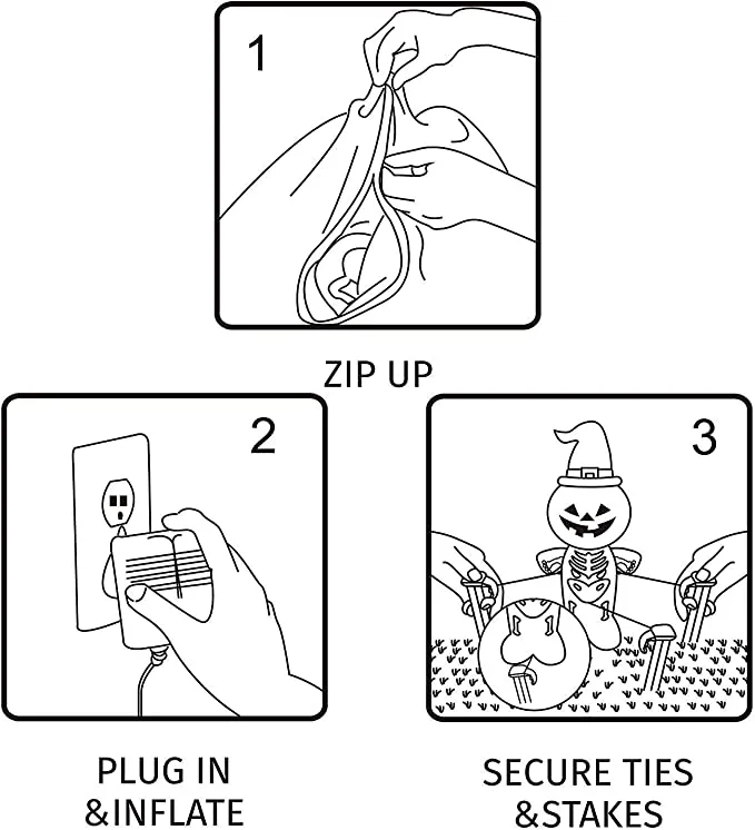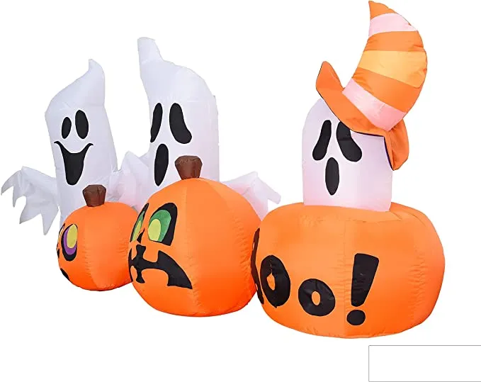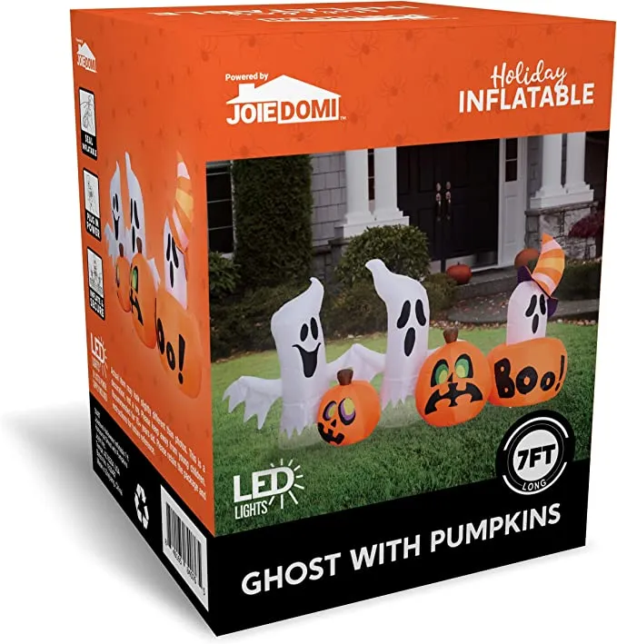 - 7 feet long horizontal ghost with pumpkins inflatable comes with extended cords, ground stakes, fastened ropes, built-in sandbags, and a plug with ul certification.