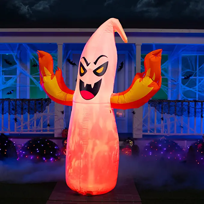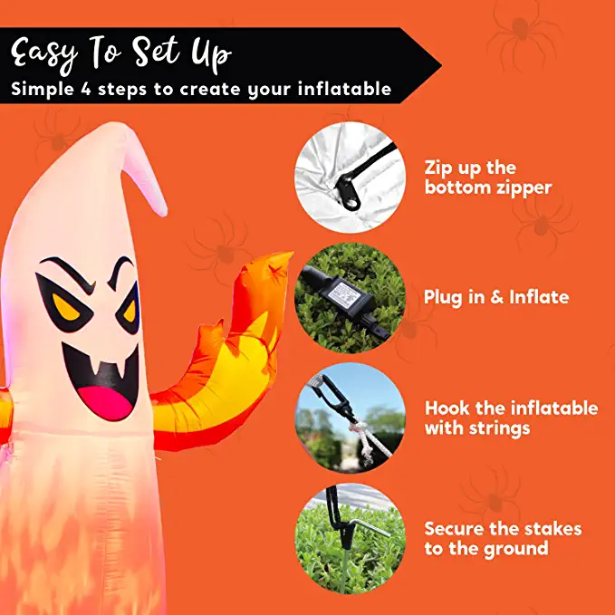 - 8 feet tall scary ghost inflatable with flaming fire comes with extended cords, ground stakes, fastened ropes, built-in sandbags, and a plug with ul certification.