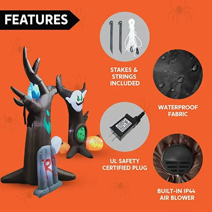 • Inflatable Halloween Tree Decorations features ghosts, tombstone, pumpkins, and more. It comes with an extended cord, ground stakes, fastened ropes, built-in sandbags, and a plug with UL certification.