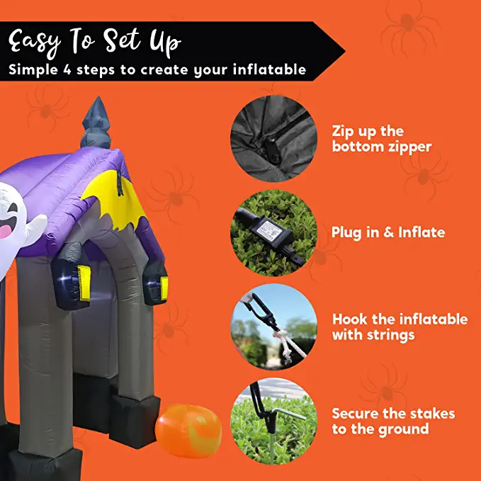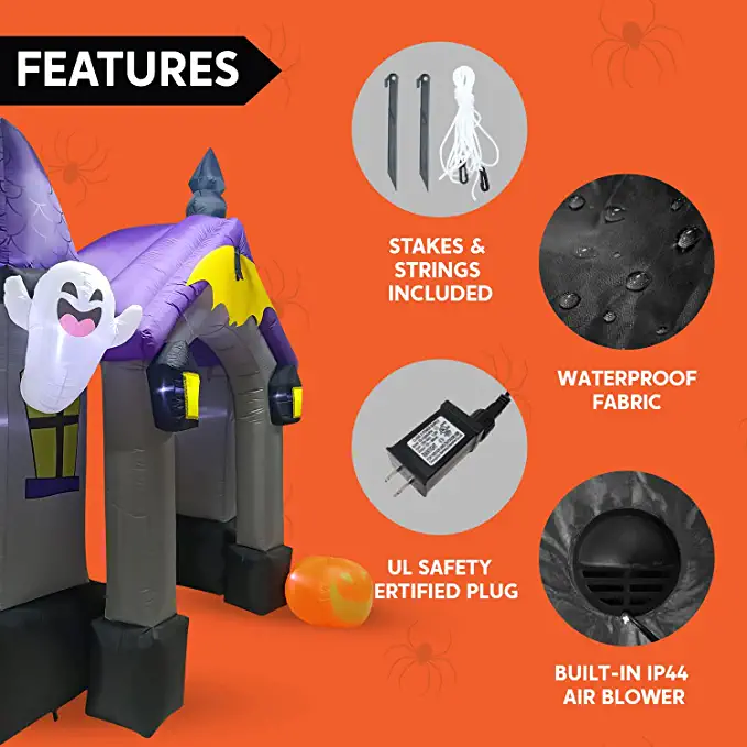 • Inflatable Haunted House Walkthrough features extended cords, ground stakes, fastened ropes, built-in sandbags, and a plug with UL certification