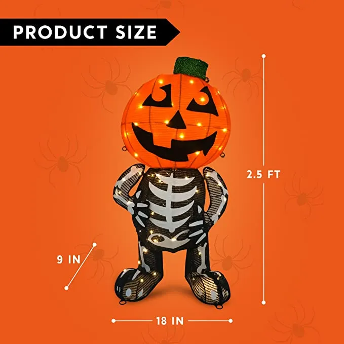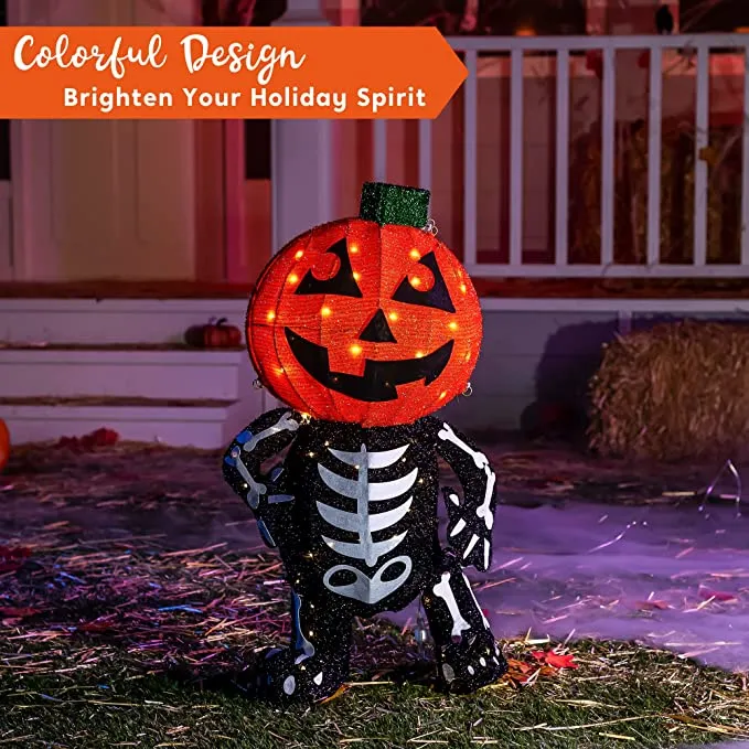 - Our tinsel stacked pumpkins yard light includes 30 in tall skeleton pumpkins with led warm lights in clear wire, metal stakes, and zip ties. Made of tinsel material.